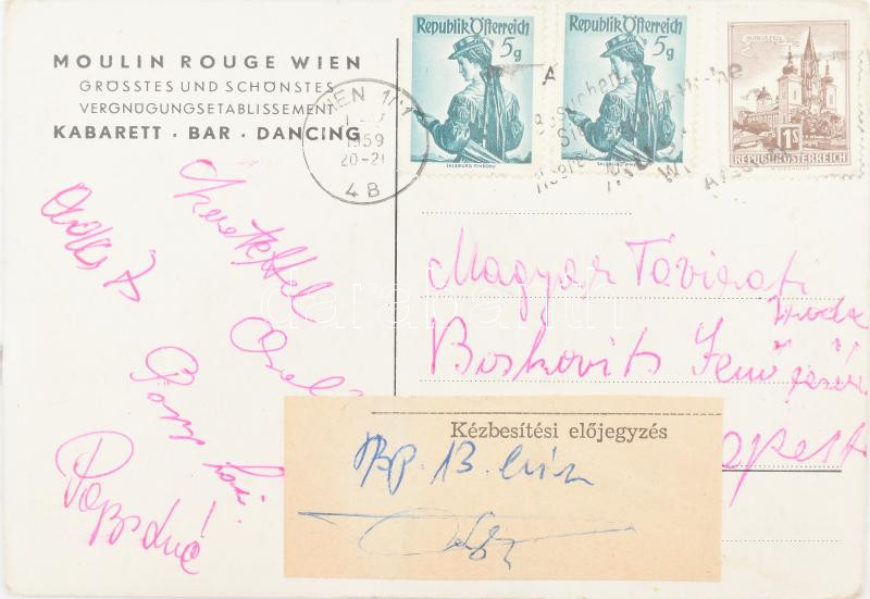 1959 Bécsi képeslap Papp László, Adler Zsigmond és Papp László felesége aláírásával