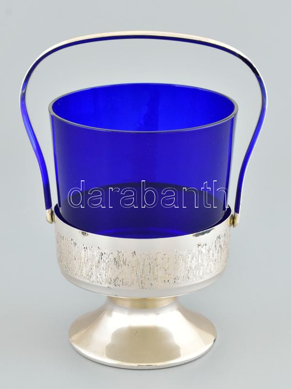 Design üveg kínáló, ezüstözött fém tartóban, kis kopásokkal, jelzés nélkül m: 17 cm