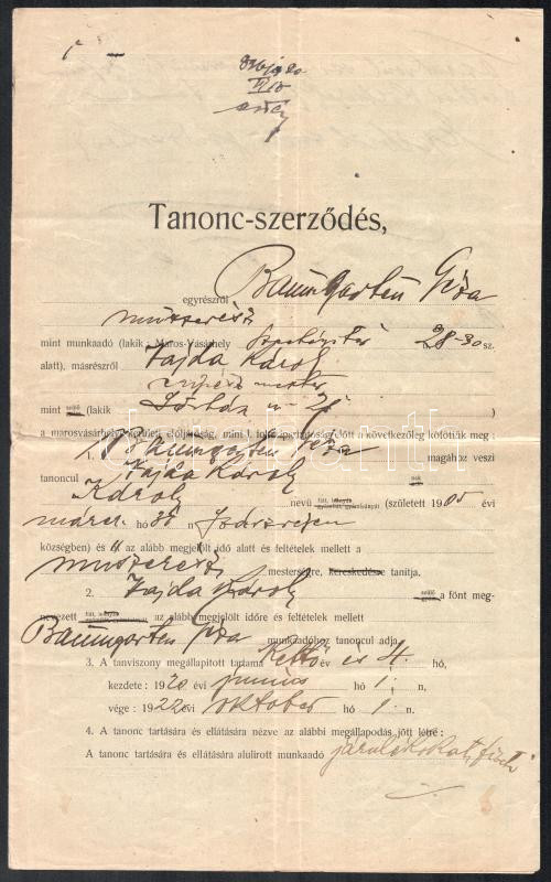 1920 Marosvásárhely (Târgu Mures), tanonc-szerződés, Baumgarten Géza m...