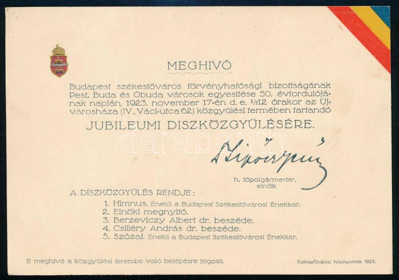 1923 Budapest egyesítése alkalmából tartott fővárosi díszközgyűlés meghívója