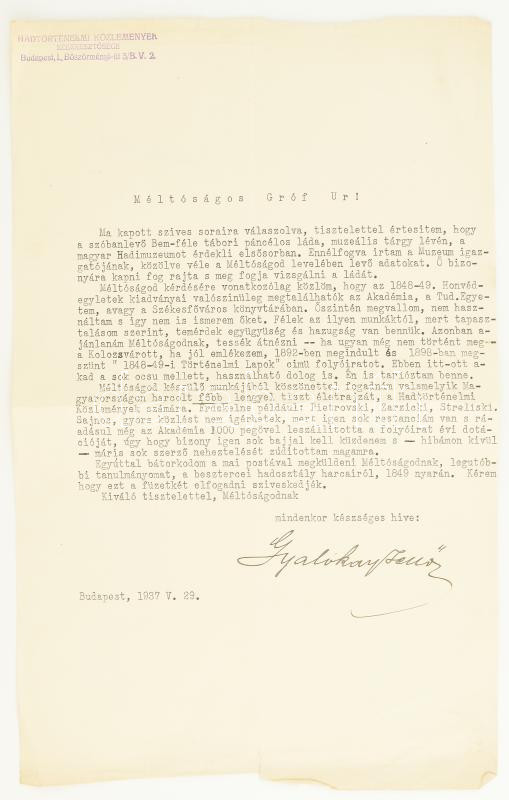 Description: 1937 Gyalókay Jenő (1874-1945) katonatiszt, hadtörténész levele feltehetően gróf Domszky (Dambsky) Pál (1903-1974) történészhez 1848-as szabadságharc témában, említ egy Bem-féle tábori páncélos ládát valamint kéri egy Magyarországon harcolt lengyel tiszt életrajzának elküldését. Egy gépelt oldal, Gyalókay Jenő autográf aláírásával, Hadtörténelmi Közlemények Szerkesztősége bélyegzőjével.