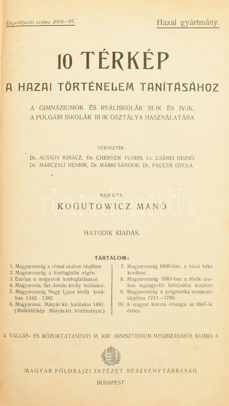 Description: cca 1900-1910 Tíz térkép a hazai történelem tanításához. Tervezték: Dr. Acsády Ignác et al. Rajzolta: Kogutowicz Manó. Bp., Magyar Földrajzi Intézet Rt. Hatodik kiadás. Papírkötésben, sérült, szétváló fűzéssel.