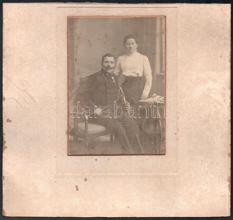 Description: cca 1910 Szatmár, Csendőr szakaszvezető a feleségével, Hollósi utóda Friss Lenke fényképész műtermében készült, szárazpecséttel jelzett, keményhátú vintage fotó, kissé foltos, 15x10 cm