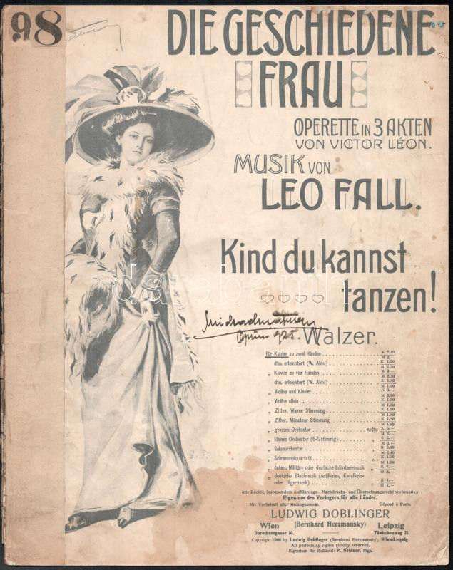 Description: 1908 Die geschiedene Frau. Operette in 3 Akten von Victor Léon. Musik von Leo Fall. Wien-Leipzig, Ludwig Doblinger, 12 p. Német nyelvű kotta, sérült papírkötésben, foltokkal.