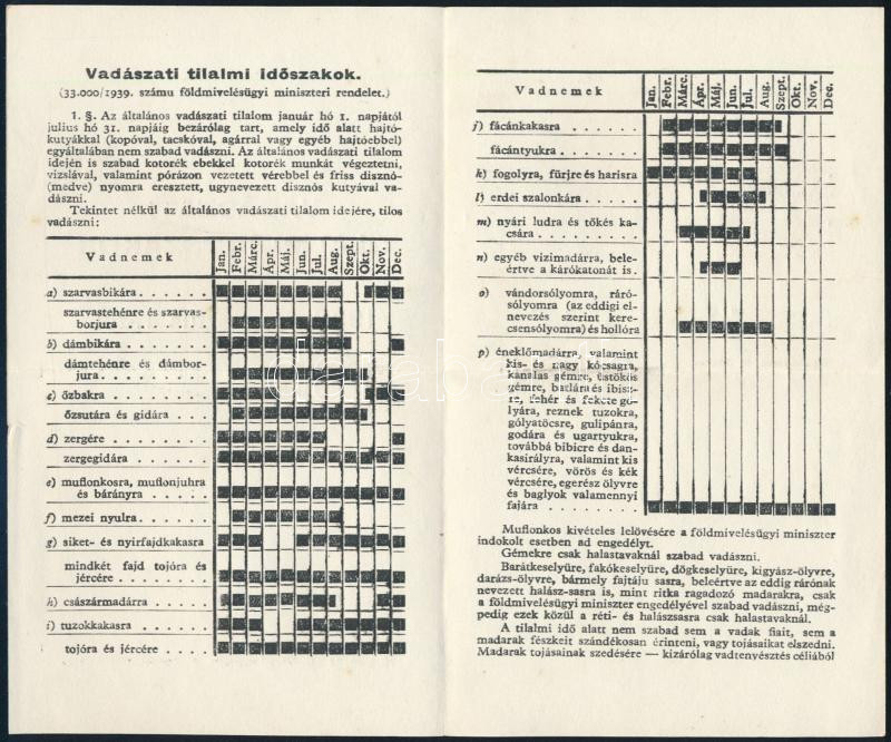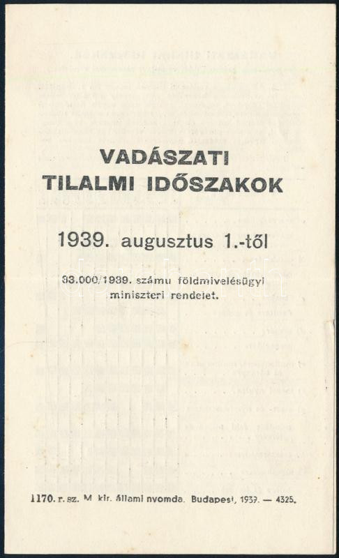 1939 Vadászati tilalmi időszakok 1939. aug. 1-től (földmívelésügyi miniszteri rendelet alapján), tájékoztató prospektus, (4) p.