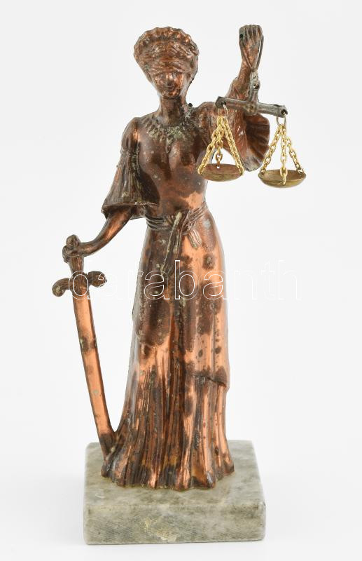 Jelzés nélkül: Justitia, réz szobor márvány talapzaton, patinával, m: 26 cm