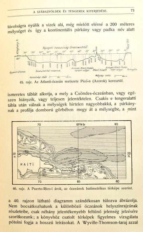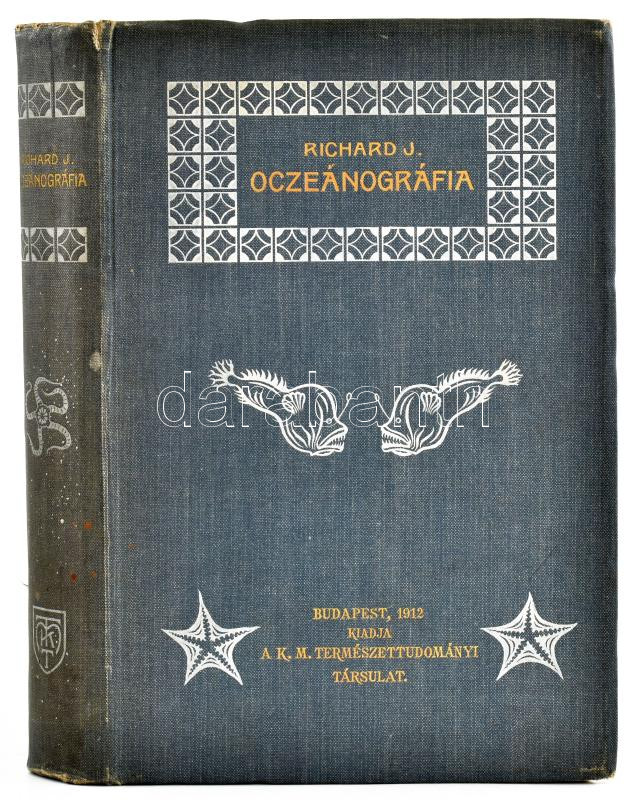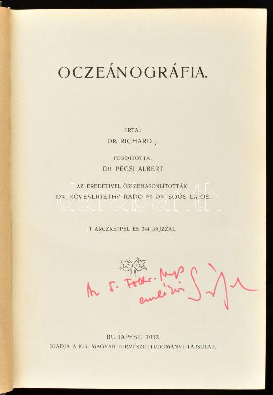 [Richard, Jules] Dr. Richard J.: Oczeanográfia. Ford.: Dr. Pécsi Albert. Az eredetivel összehasonlították: Dr. Kövesligethy Radó és Dr. Soós Lajos. Bp., 1912, Kir. M. Természettudományi Társulat ("Pátria"-ny.), XI+576 p. Kiadói aranyozott, festett egészvászon-kötés, Gottermayer-kötés, a gerincen apró sérülésekkel és foltokkal, a címlapon ajándékozási sorok/dedikáció(?).