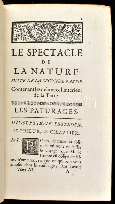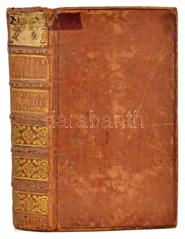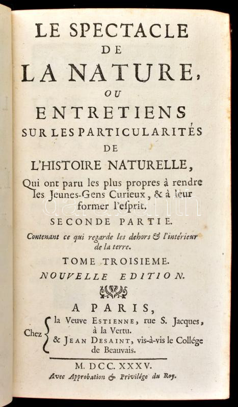 Description: Le spectacle de la nature, ou entretiens sur les particularites de l'histoire naturelle, qui ont paru les plus propres a rendre les Jeunes-Gens curieux, & a leur former l'esprit. Tom. III. Paris, 1735 Estiene - Desaint. Korabeli, aranyozott egészbőr kötésben