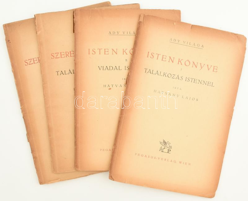 Hatvany Lajos: Ady világa. 1-4. köt. Isten könyve I-II. köt. I. Találkozás istennel. II. Viadal istennel. Szerelem könyve I-II. köt. I. Találkozás a nővel. II. Ady és Léda. Wien, [1922-1923], Pegasus. (Hamburger ny.). 52; 88; 80; (81)-191+1 p. Kiadói papírkötésekben, szakadozott borítókkal, az I. kötet kissé sérült borítóval, szakadozott lapszélekkel, a IV. kötet hátsó borítója hiányos, sérült lapokkal.