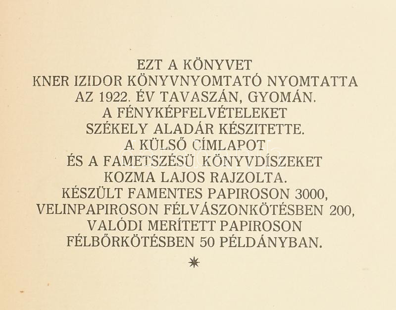 Révész Béla: Ady Endre életéről, verseiről, jelleméről. A költő fényképfelvételeit Székely Aladár készítette. Gyoma, 1922, Kner Izidor,1 t.+219 p.+2 sztl. lev.+9 t. Oldalszámozáson belül 18, a költő leveleinek, kéziratainak reprodukciójával. A külső címlapot és a fametszésű könyvdíszeket Kozma Lajos rajzolta. Kiadói papírkötés. "Készült famentes papíroson 3000,velinpapíroson félvászon-kötésben 200, valódi merített papíroson félbőrkötésben 50 példányban." Számozatlan példány.