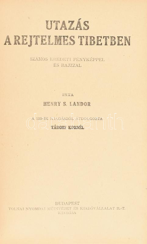 Henry S. Landor: Utazás a rejtelmes Tibetben. Átdolgozta: Tábori Kornél. Bp., [1927], Tolnai, 315+(2) p. Szövegközi és egészoldalas illusztrációkkal. Kiadói illusztrált kartonált papírkötés, szép, gyűjtői állapotban.