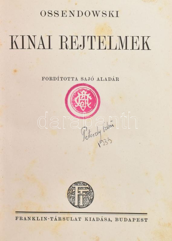 [Ossendowski, Ferdynand Antoni (1876-1945)]: Ossendowski: Kínai rejtelmek. Ford.: Sajó Aladár. Bp., [1930], Franklin-Társulat, 179+(1) p. Kiadói aranyozott egészvászon-kötés, kissé kopottas borítóval, kissé foltos lapokkal, tulajdonosi névbejegyzéssel.