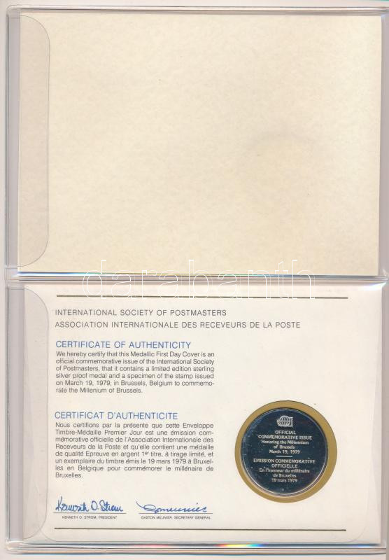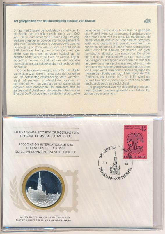 1979. "Postamesterek Nemzetközi Szövetsége hivatalos emlékérem kiadása 1979 - Belgium" Ag emlékérem érmés borítékban, első napi bélyegzős bélyeggel, holland nyelvű leírással (20g/0.925/39mm) T:PP