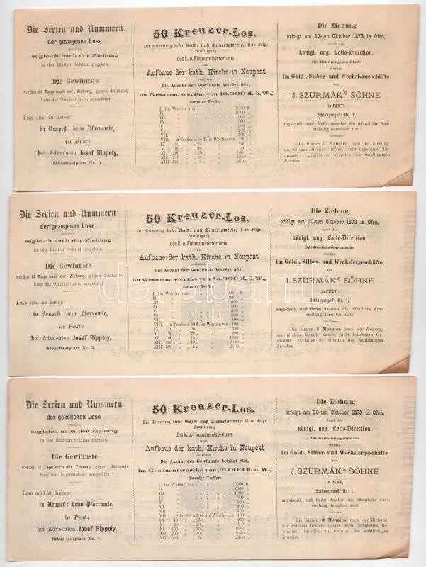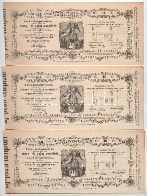 Description: Budapest / Pest 1873. "A Magyar Királyi Pénzügyminisztérium arany- és ezüst sorsjátéka az Újpesti Katolikus Templom felépítésének javára" 50kr értékben (3x) sorszámkövetők T:AU nagyobb szamárfül, a sarkoknál a lap kissé megsárgult