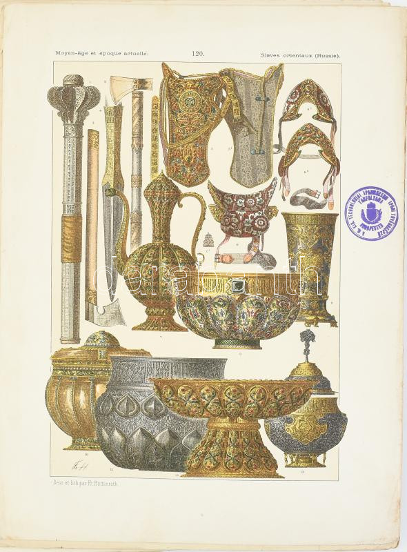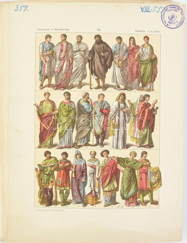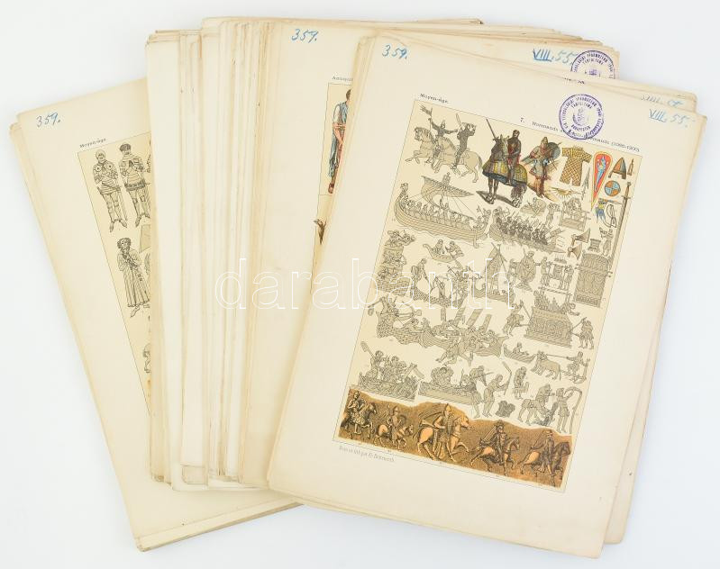 200 db viselettörténeti és történelmi metszet, 1900 körül. Litográfia, papÃr, jelzett a metszeten (Dess. et lith. par Fr. Hottenroth), intézményi bélyegzÅ‘vel, lap sarkaiban ceruzás jelzéssel, lap széle részben sérült és foltos, 24x16,5 cm.