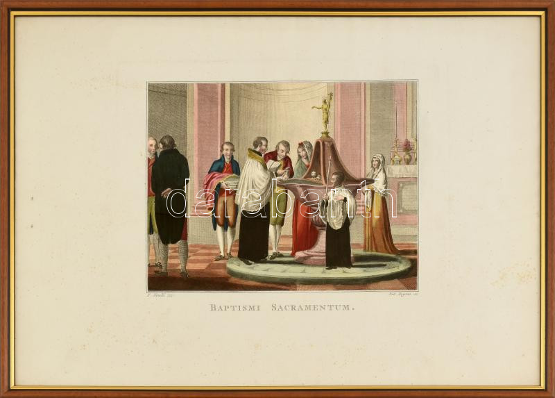 Description: Francesco Novelli (1767-1836) után, Antonio Regona (1760-1853) metszése: Baptismi sacramentum. Színezett rézmetszet, papír, jelzett a metszeten. Kissé foltos. Lapszéli apró sérüléssel. Üvegezett fakeretben. 20x26 cm