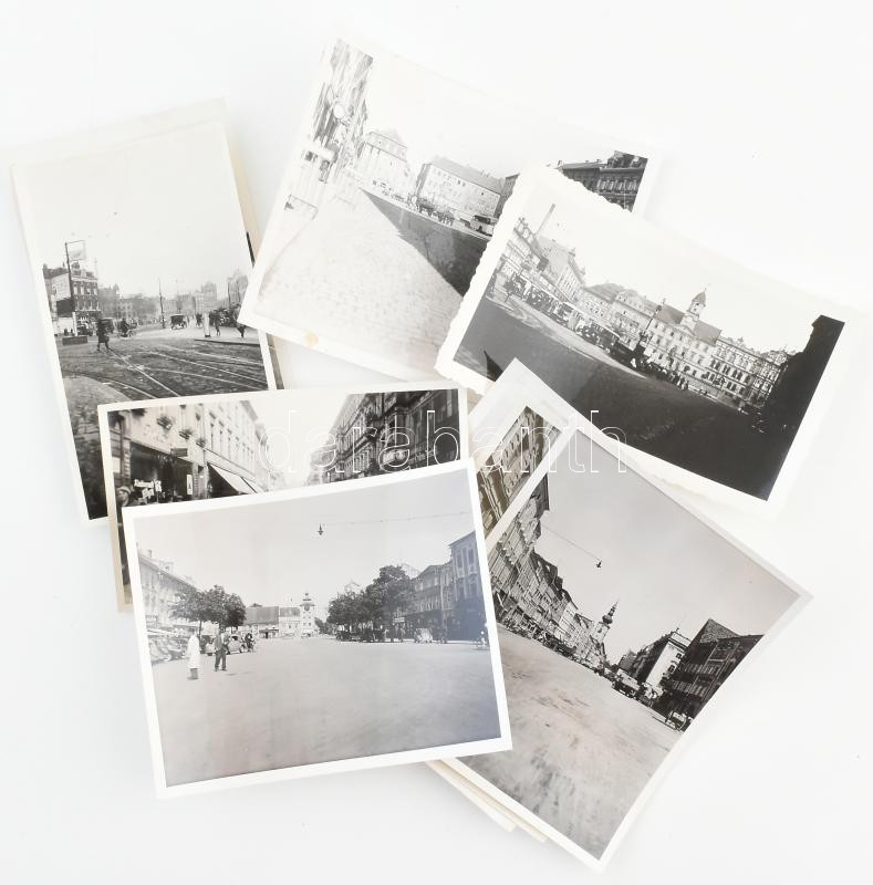 1932-1938 9 db fénykép különböző európai városokról, autók, buszok, üzletek, stb., 6,5×10 és 10,5×8,5 cm közötti méretekben