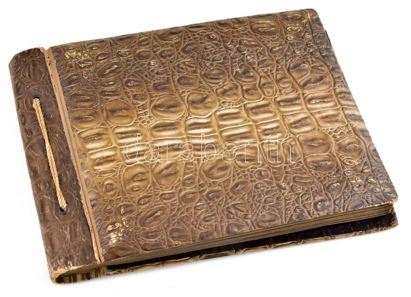 Description: cca 1940-1960 Családi fotóalbum, kb. 40 db fotóval (nagyrészt 18x13 cm körül), harántalakú, zsinórfűzéses, krokodilbőr-mintás albumban, kissé kopott borítóval, 27x19,5 cm
