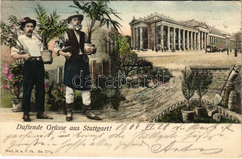 1904 Stuttgart, Duftende Grüsse aus Stuttgart / gardeners, tram (EK)