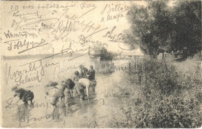1905 Budapest XIII. Vizafogó, Duna part, kikötő hajóval, mosóasszonyok...