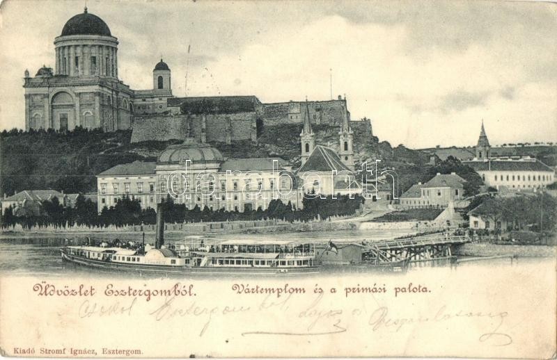 Budapest oldalkerekes személyszállító gőzhajó Esztergomnál, vártemplom és prímási palota előtt / Hungarian passenger steamship in Esztergom