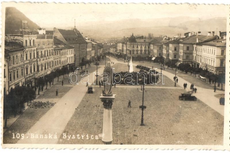 Besztercebánya, Banska Bystrica; Főtér, Alios Fischer, Pavel Toth, Julius Papp üzletei, automobilok, szobor / main square, shops, automobiles, statue (Rb)