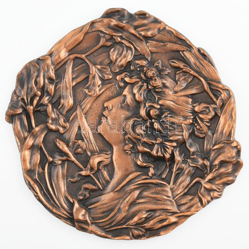 Szecesszió jellegű hölgy, könnyített fém, bronzírozva, fali, jelzés nélkül, hibátlan, d: 30 cm