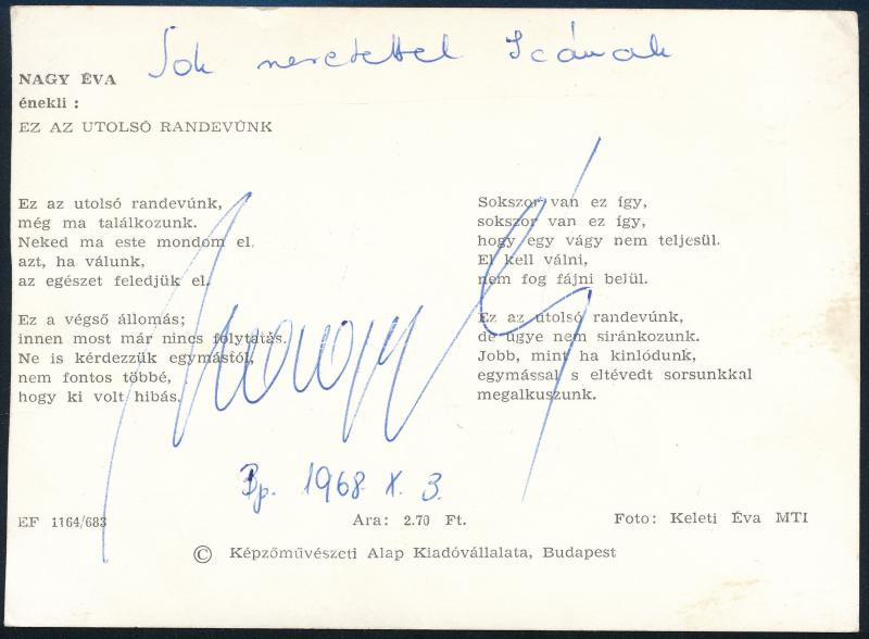 1968 Nagy Éva táncdalénekesnő aláírása az őt ábrázoló fotó hátoldalán,...