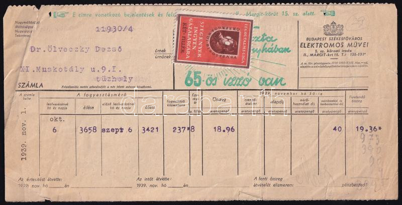 1939 Budapest Székesfőváros Elektromos Művei számla, "Légoltalmi Liga Országos Női Bizottsága - Szegények ingyen gázálarcára" 2 f segélybélyeggel
