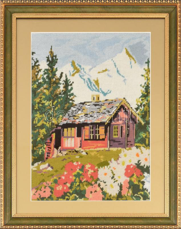 Dekoratív üvegezett fakeret, benne gobelin, 35,5x28 cm