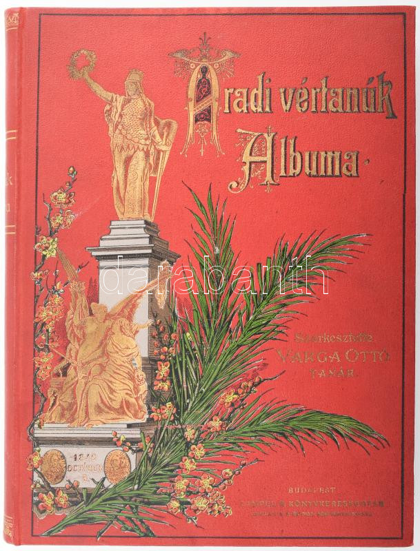 Aradi vértanúk albuma. Arad sz. kir. város közönsége és az aradi "Kölcsey-Egyesület" megbÃzásából szerkesztette Varga Ottó. Bp.,(1902), Lampel R. (Wodianer F. és Fiai),1 t.(dÃszcÃmlap)+297+3 p.+7 (hasonmás)+1 t. Ötödik kiadás. Kiadói aranyozott, festett egészvászon-kötés, Leszik-kötés, festett lapélekkel, Szép állapotú darab