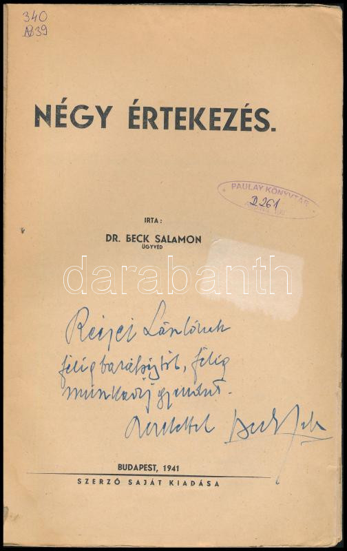 Dr. Beck Salamon: Négy értekezés. Bp., 1941, szerzői kiadás (Karcag, K... https://www.darabanth.com/en/441-Online-auction/441.0/Books/Books-Law~500036/Dr-Beck-Salamon-Negy-ertekezes-Bp-1941-szerzoi-kiadas-Karcag-Kertesz-Jozsef-ny-80-~II2901830