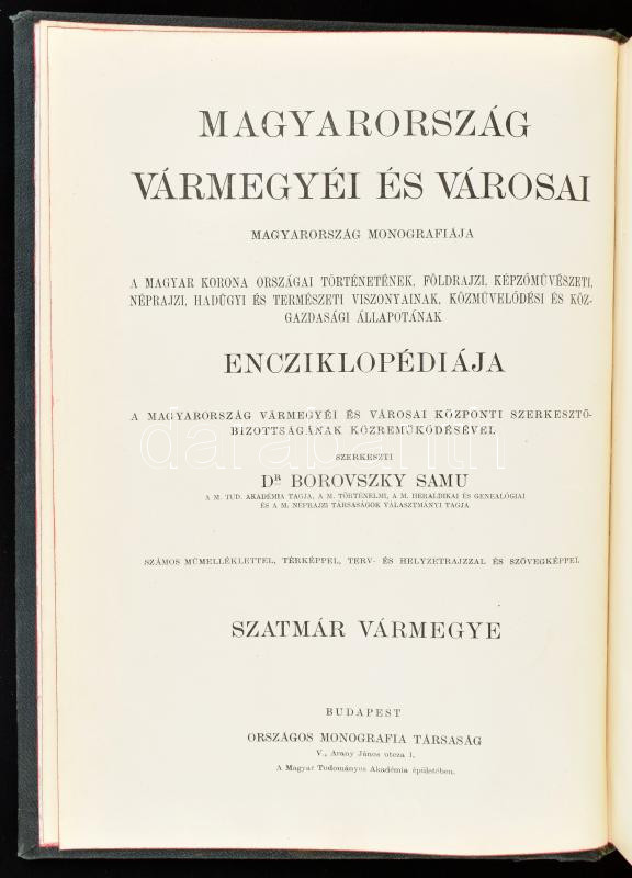 Szatmár vármegye és Szatmár-Németi sz. kir. város. Szerk.: Dr. Borovszky Samu. Magyarország vármegyéi és városai. Magyarország monográfiája. Bp., [1908], Országos Monográfia Társaság (Légrády-ny.), 1 (színes térkép) t. + XV+636 p. + 2 (színes) t. + 1 (színes térkép) t. + 316 p. Gazdag szövegközi és egészoldalas képanyaggal illusztrálva. Kiadói aranyozott, festett, dombornyomott egészvászon-kötés, Gottermayer-kötés, festett lapélekkel, a borítón némi kopással, összességében jó állapotban, intézményi bélyegzőkkel.