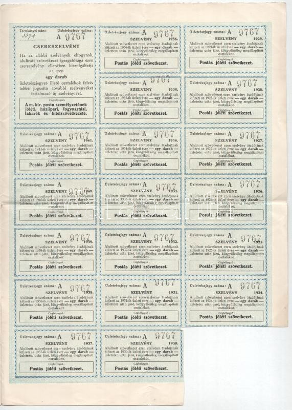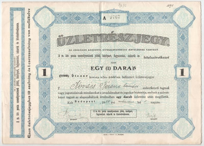1924. "A m. kir. posta személyzetének jóléti, háziipari, fogyasztási, takarék és hitelszövetkezet" üzletrészjegye 5000K-ról, szelvényekkel T:F