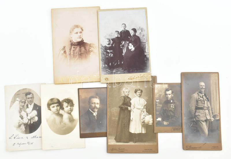 cca 1910-1920 Vegyes fotó tétel, 8 db, közte keményhátú fotók, és 2 fotólap, benne 2 katonafotóval, 16x10 cm és 10x6 cm közötti méretben