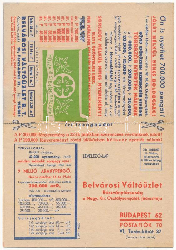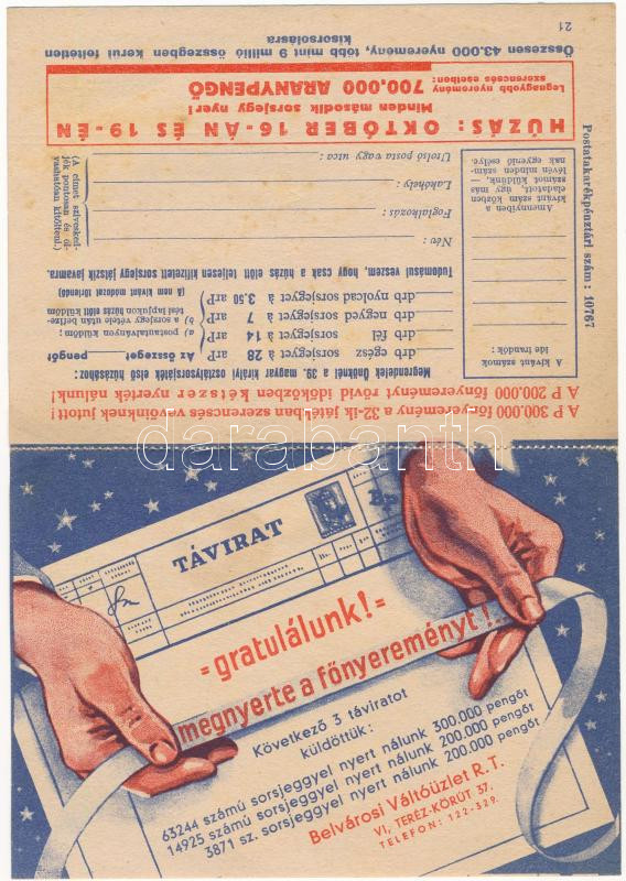Belvárosi Váltóüzlet Rt. kinyitható reklám képeslapja + sorsjegy (fl)