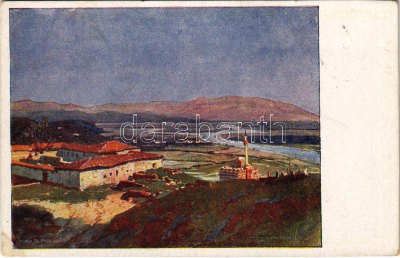 Description: Lezhe (Alessio), Offizielle Karte für: Rotes Kreuz, Kriegsfürsorgeamt Kriegshilfsbürö Nr. 581 / WWI Austro-Hungarian K.u.K. military art postcard, general view s: Karl Ludwig Prinz (fl)