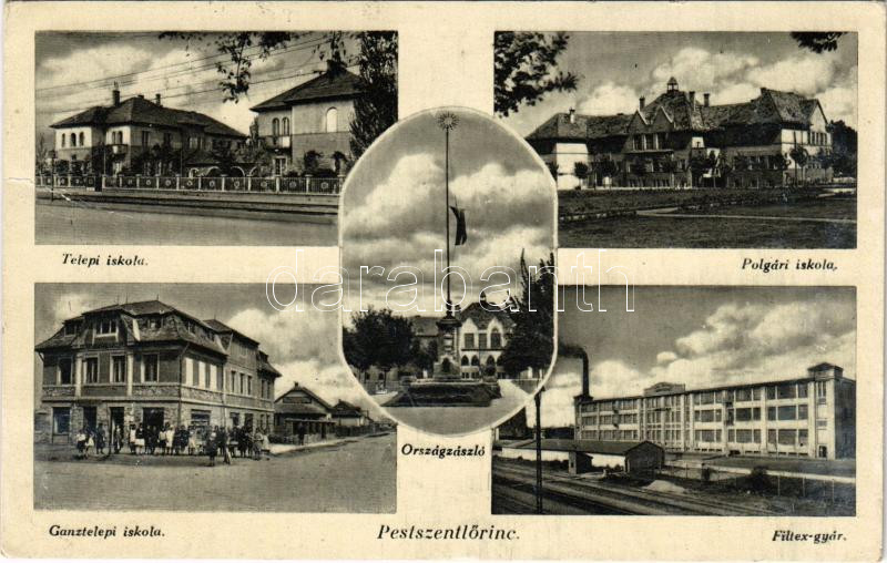 Budapest XVIII. Pestszentlőrinc, Pusztaszentlőrinc, Szentlőrinc; Telepi iskola, Polgári iskola, Ganztelepi iskola, Filtex gyár, Országzászló (Rb)