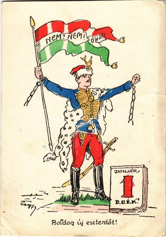 1940 BUÉK! Boldog Új Esztendőt! Nem! Nem! Soha! / Hungarian irredenta propaganda with New Year greeting, Trianon s: Pálffy (szakadás / tear)