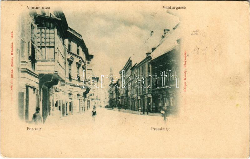 1898 (Vorläufer) Pozsony, Pressburg, Bratislava; Ventur utca, Willimszky Gyula üzlete. Körper Károly fényképész, Ottmar Zieher / Venturgasse / street, shops (EK)