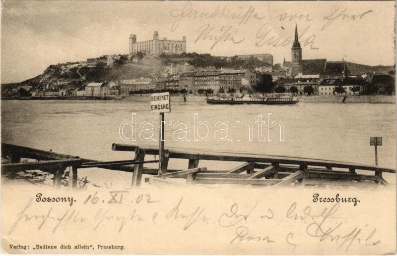 1902 Pozsony, Pressburg, Bratislava; vár, gőzhajó. Verlag "Bediene dich allein" / castle, steamship (EK)