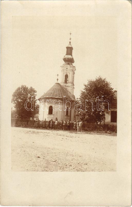 1915 Boszút, Bázatő, Bosut, Bossúthfalu (Szávaszentdemeter, Sremska Mitrovica); templom és osztrák-magyar katonák / church, WWI Austro-Hungarian military soldiers. photo + "2/IV. Hadtáp Zászlóalj Parancsnokság" + "K.u.k. Feldpostamt 318."