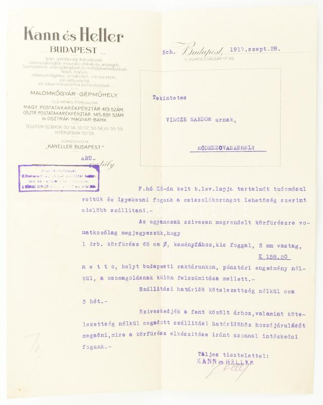 1917 Bp., Kann és Heller ipari, gazdasági, bányászati (stb.) berendezések fejléces levélpapírra írt üzleti levél (árajánlat)