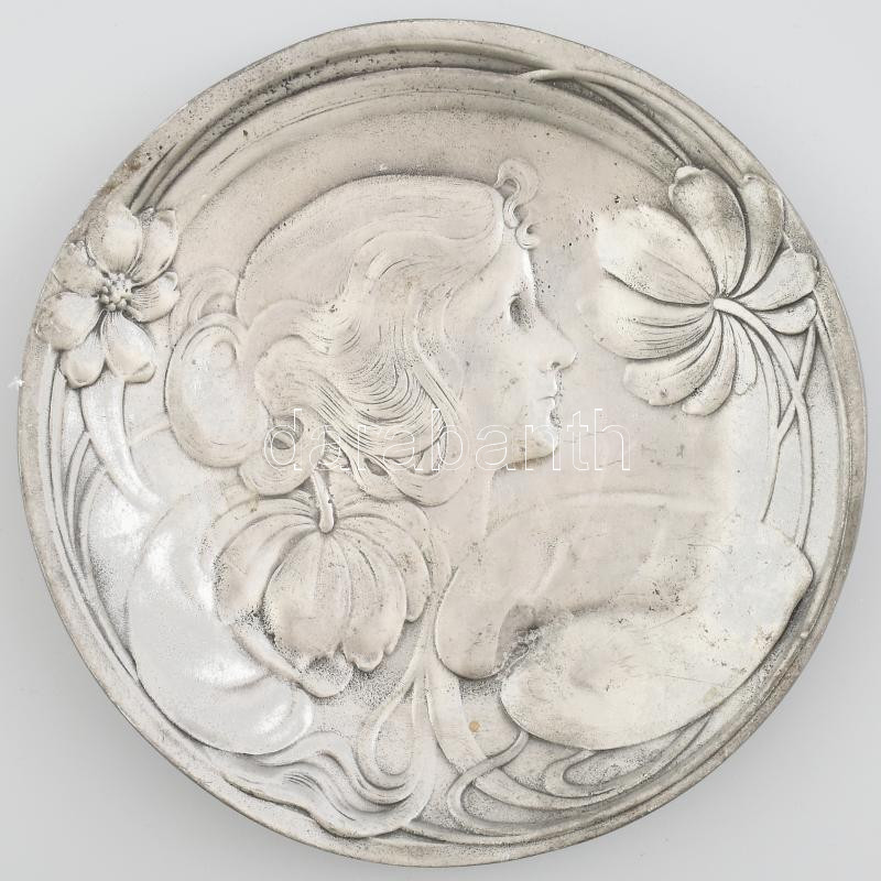 Szecessziós ón dísztál. Jelzett, Hibátlan 17,5 cm /Art nouveau tin plate