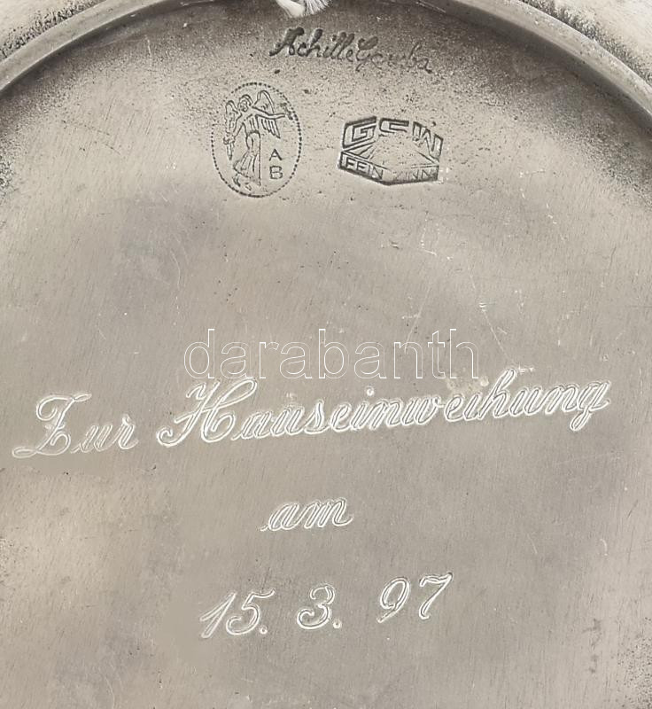 Szecessziós ón dísztál. Jelzett, Hibátlan 17,5 cm /Art nouveau tin pla...