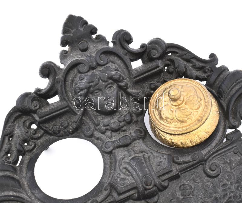 Szecessziós stílusú öntöttvas kalamáris, női fej díszítménnyel, egyik tartály alja hiányzik, jelzés nélkül, szép állapotban, 26x23 cm