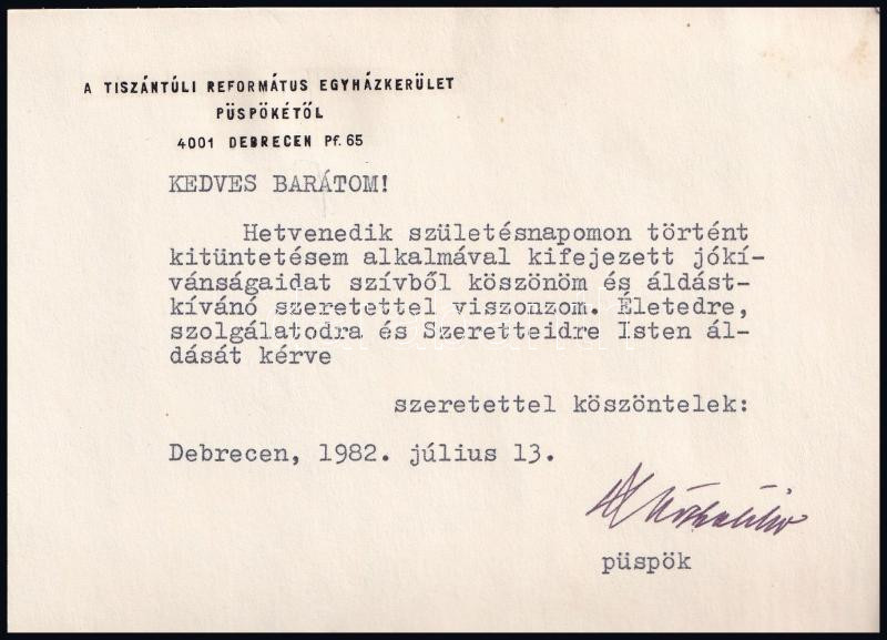 Description: 1982 id. Bartha Tibor (1912-1995) Tiszántúli Református Egyházkerület püspökének aláírása egy köszönő lapon, borítékban, benne más jellegű értesítő (DOTE) levéllel is.