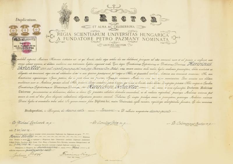 1946 Bp., Kir. M. Pázmány Péter Tudományegyetem orvosi diploma Schrötter Henrik részére, szárazpecséttel, adópengős okirati illetékbélyegekkel. Feltekerve, gyűrődésekkel, kisebb lapszéli szakadással, 53,5x38 cm