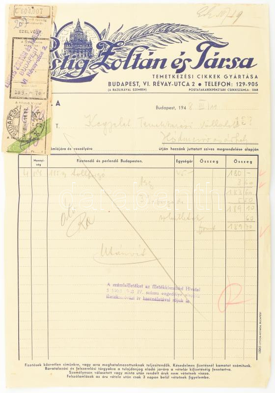 1948 Bp., Lustig Zoltán és Társa temetkezési cikkek (Bp. VI, Révay u. 2.) fejléces számla, a fejlécen a Szent István-bazilika képével