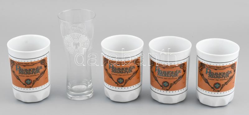 Zsolnay Pannonia Sörgyár (Pécsi Sörfőzde) porcelán poharak, 4 db, m: 11,5 cm + Dreher limitált kiadású üvegpohár, m: 17 cm
